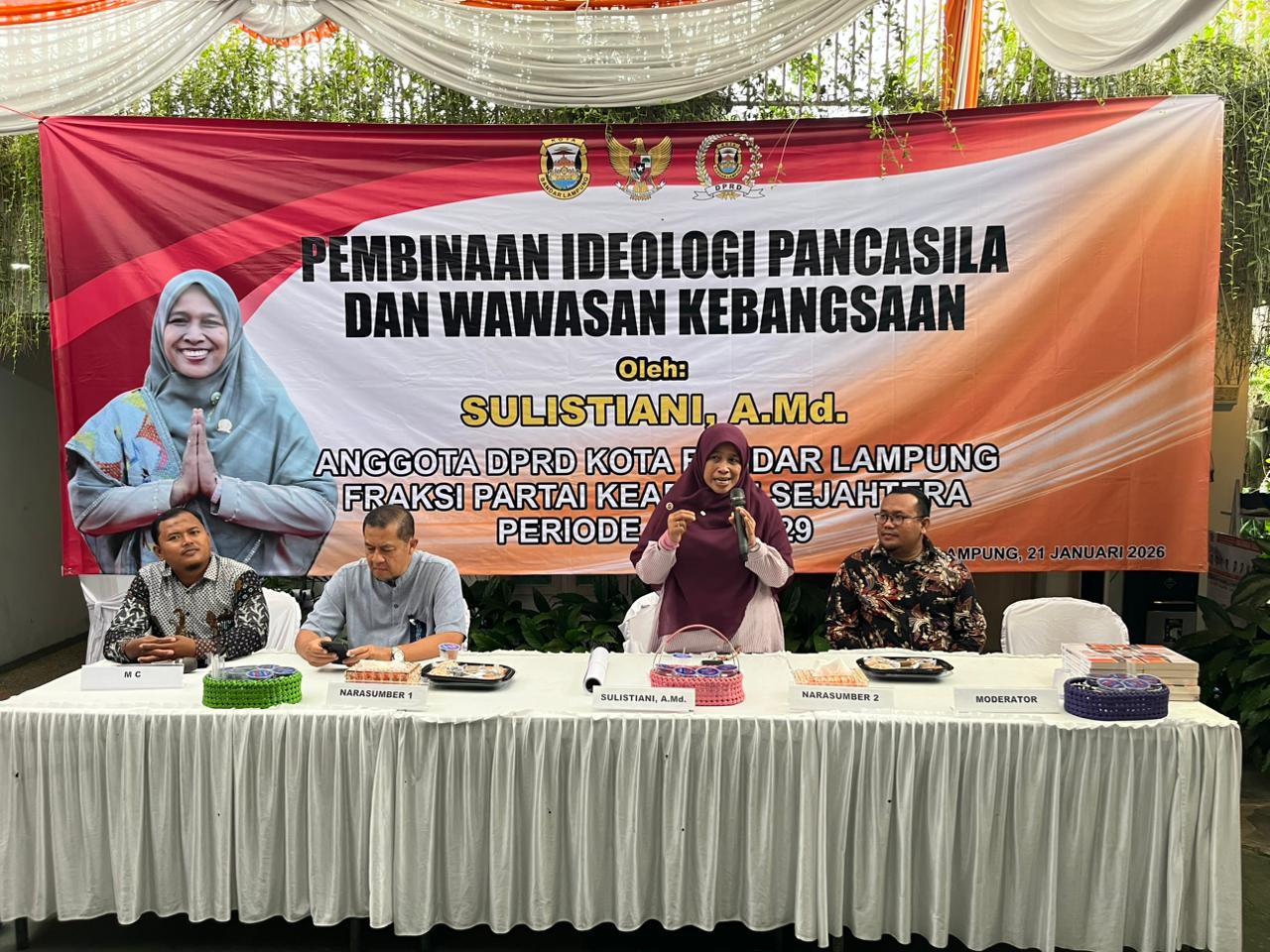 Ajakan tersebut disampaikan oleh Sulistiani saat melaksanakan kegiatan Sosialisasi Pembinaan Ideologi Pancasila dan Wawasan Kebangsaan (PIP–WK) yang digelar di Kelurahan Kemiling, Kota Bandar Lampung, Rabu (21/01/2026).