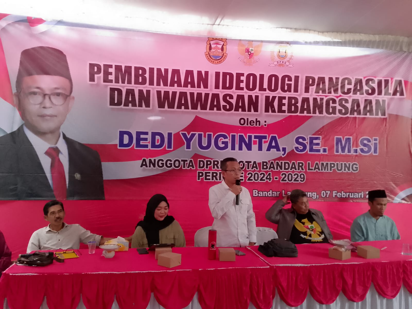 Demikian diungkapkan oleh Wakil ketua komisi III DPRD Kota Bandar Lampung dari fraksi PDI Perjuangan Dedi Yuginta, SE,M.Sisaat menggelar kegiatan Sosialisasi Pembinaan Ideologi Pancasila dan Wawasan Kebangsaan (PIP-WK) di Kelurahan Kota Baru,Kecamatan Tanjung Karang Timur (TKT) pada Sabtu (07/02/2026).