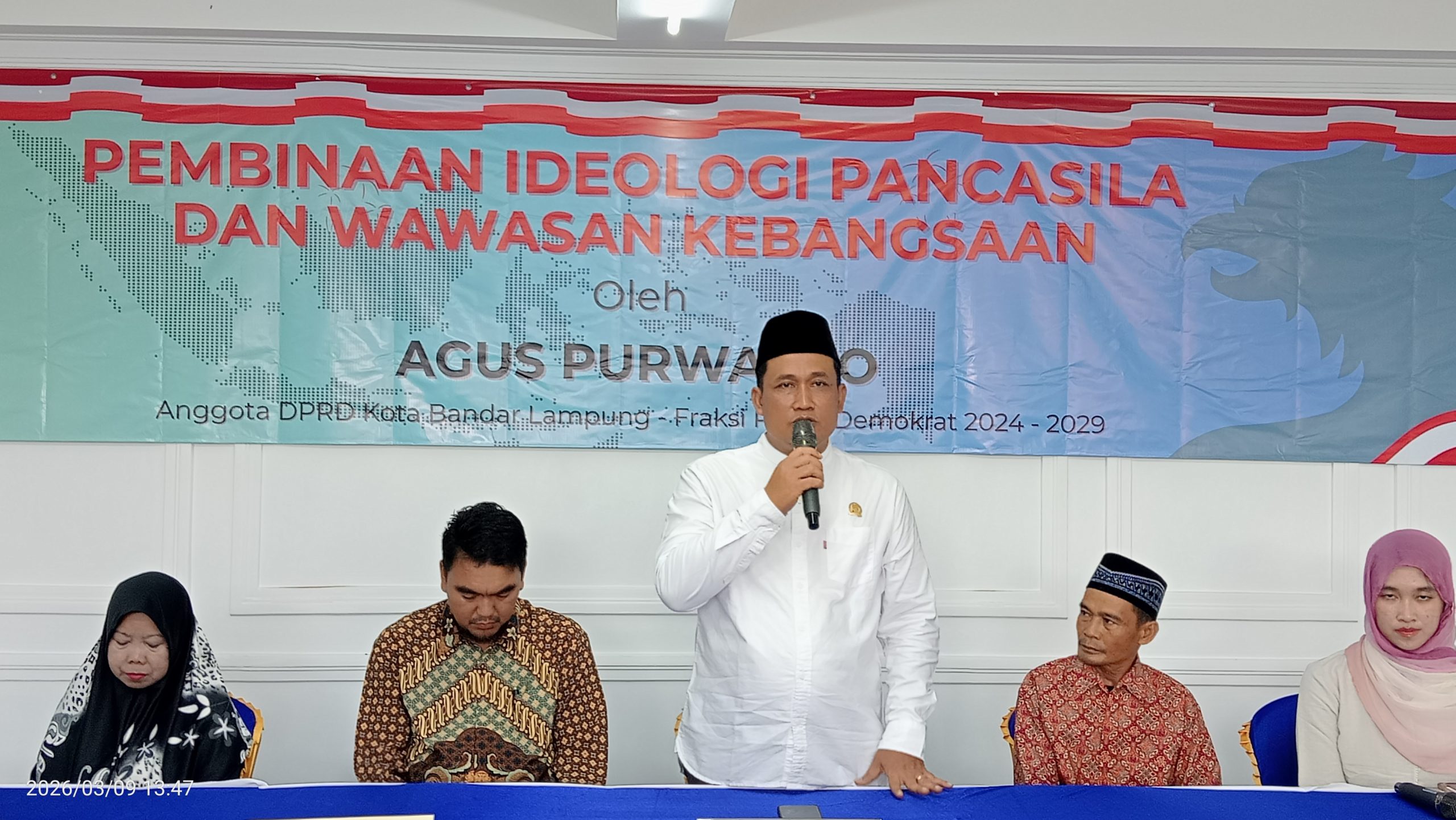 Transinformasi.com,Bandarlampung– Anggota DPRD Kota Bandar Lampung dari Fraksi Partai Demokrat, Agus Purwanto, mengajak masyarakat untuk terus mengamalkan nilai-nilai Pancasila dalam kehidupan sehari-hari di tengah lingkungan sosial.